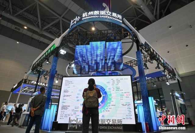 9月25日,杭州数据交易所展台吸引参观者驻足。当日,以“数字贸易商通全球”为主题的第三届全球数字贸易博览会在浙江杭州开幕,悉数亮相的各类数字科技产品吸引参观者。