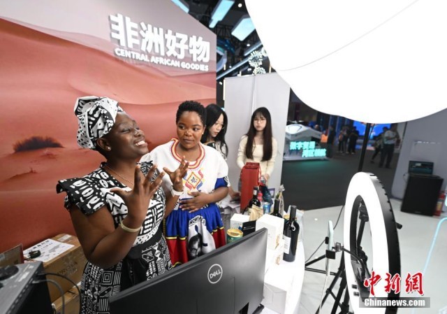 9月25日,数贸会非洲主题展区内,主播现场直播带货。当日,以“数字贸易商通全球”为主题的第三届全球数字贸易博览会在浙江杭州开幕。本届数贸会总规模达15万平方米,设置1个综合展区和8个特色数字产业展区,32个国家和地区超1500家企业参展,国际企业参展数量和面积占比均超20%。
