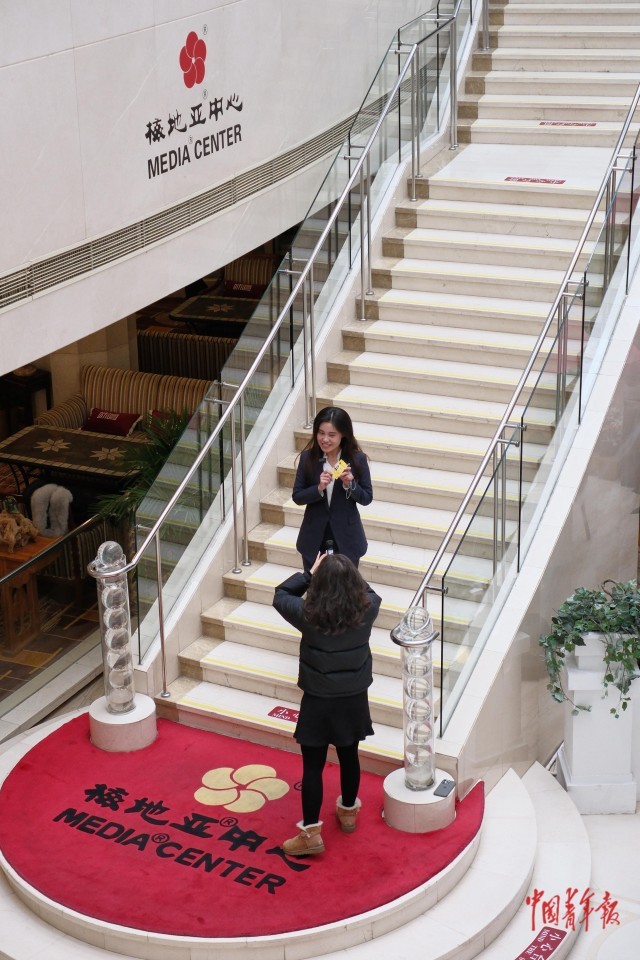 2月27日,北京梅地亚中心,两名记者正在拍摄领取记者证件的Vlog。中青报·中青网记者 田嘉硕/摄