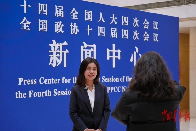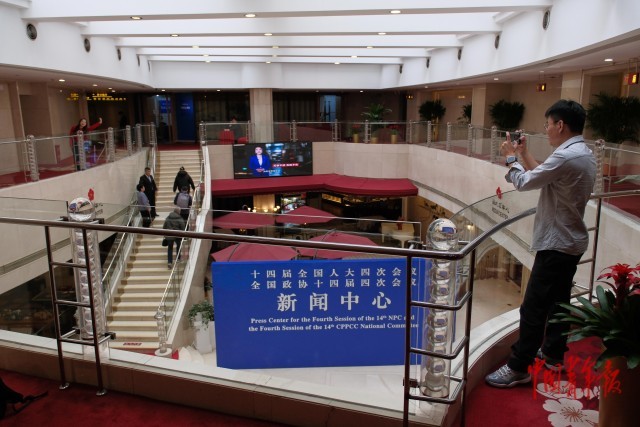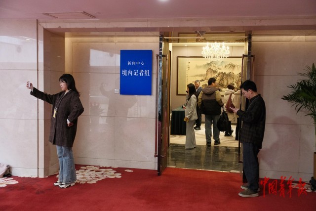 2月27日,北京梅地亚中心,记者在全国两会新闻中心拍摄2026年全国两会预热视频。中青报·中青网记者 田嘉硕/摄
