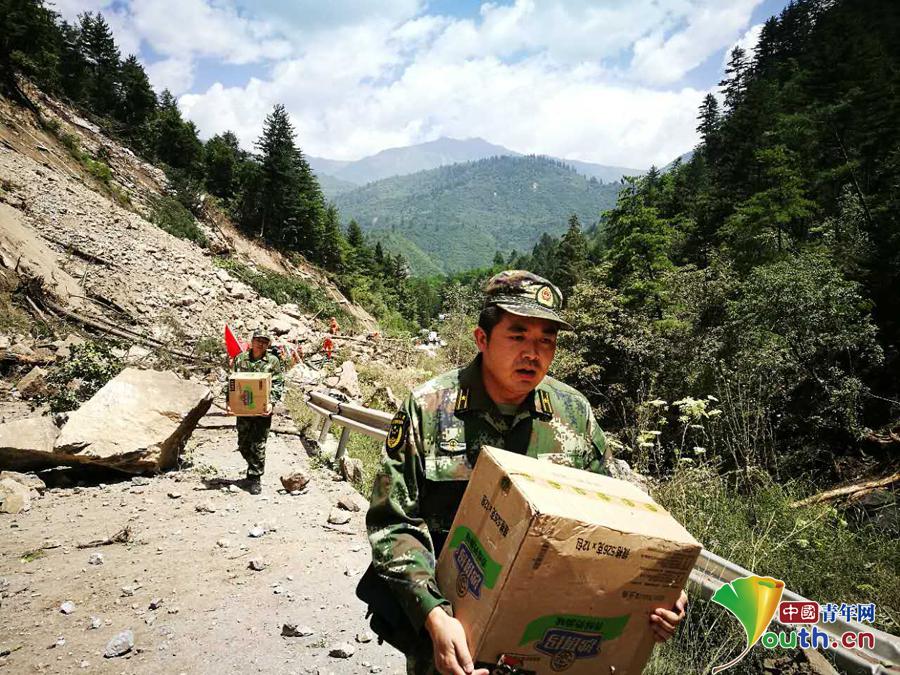 8月9日中午12时左右,武警官兵们抱着物资徒步前行,道路已经被滚石封闭,仍不时有石头从山体滚落,但是这并未能阻挡他们前行的脚步。中国青年网通讯员 蔡必维 摄