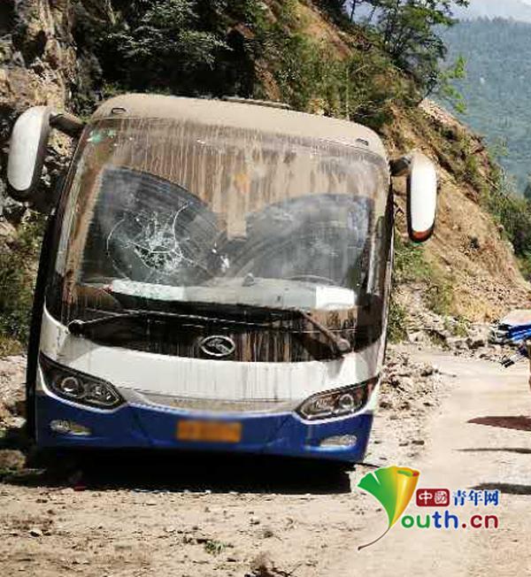 路边停放的一辆大巴车,前窗玻璃被滚石击碎。中国青年网通讯员 蔡必维 摄