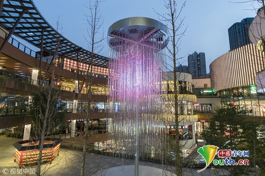 2017年12月27日,上海,近日,连续两年被意大利知名网站《designboom》评为全球十大必看展览“teamLab水晶烟花”在虹口区一商场室外广场亮相。这是“水晶烟花”在海外首次展出,同时也是中国首展。当天瑞虹天地月亮湾看到,闪烁多彩的LED灯光在装置中变幻上升,伴随歌曲《爱很简单》的悠扬旋律,营造出梦幻而温暖的气氛,现场视听效果颇为震撼。