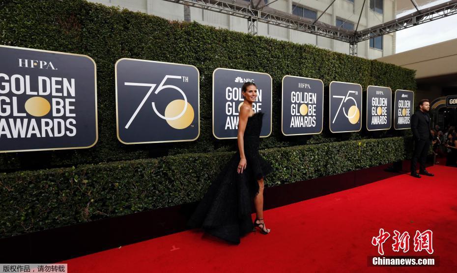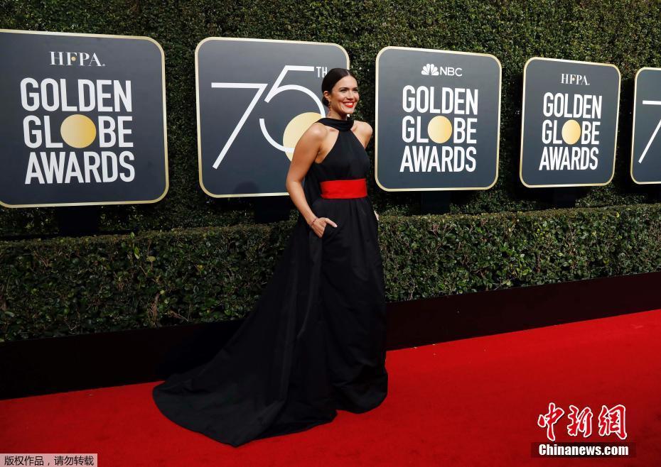 当地时间1月7日,第75届金球奖在美国比佛利山希尔顿酒店举行。今年是金球奖75周年,主办单位好莱坞外国记者协会也花心思选择了金红配色来装饰红毯,到处都是75周年的标志。图为女星曼迪·摩尔。