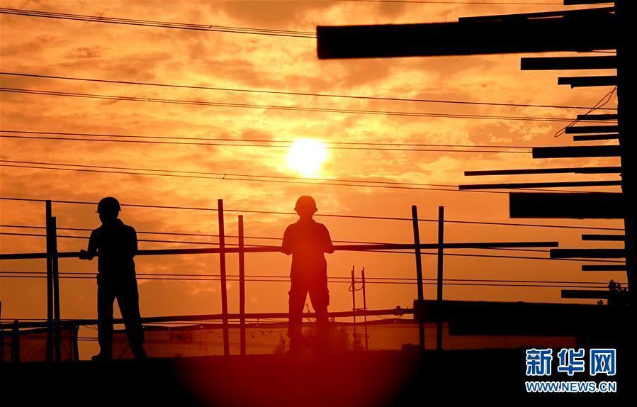 7月30日,在山东省淄博市沂源县悦庄镇一建设工地,两名钢筋工在夕阳下劳作。 烈日炎炎,热浪袭人。建筑工地的劳动者不畏酷暑,坚守岗位,为城市的建设奉献汗水。 新华社发(赵东山 摄)