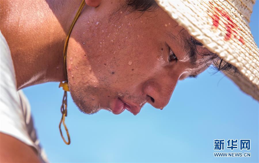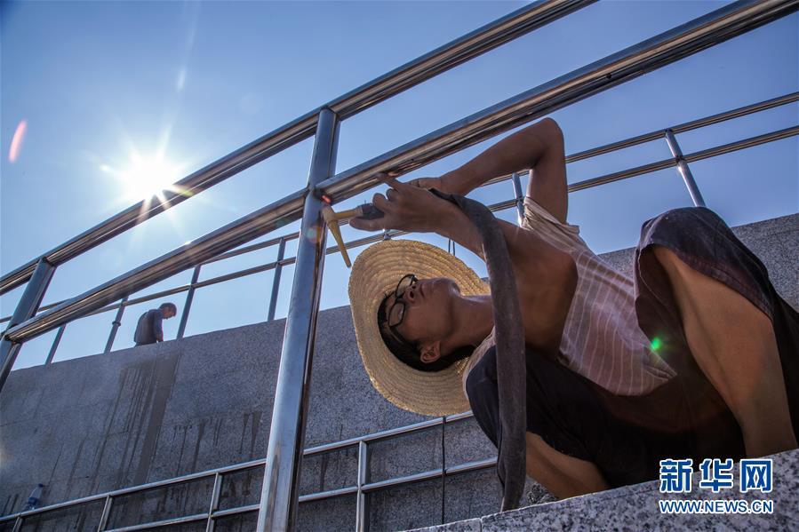 7月30日,在山东省淄博市沂源县悦庄镇一建设工地,一名工人在施工作业。 烈日炎炎,热浪袭人。建筑工地的劳动者不畏酷暑,坚守岗位,为城市的建设奉献汗水。 新华社发(赵东山 摄)