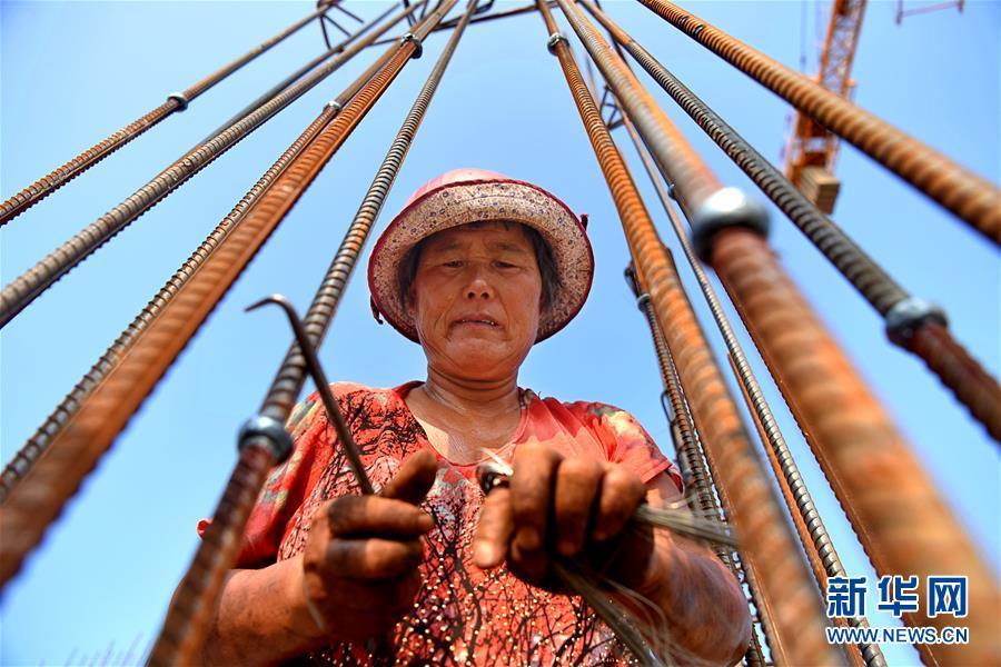 7月30日,在山东省淄博市沂源县悦庄镇一建设工地,一名钢筋工在施工作业。 烈日炎炎,热浪袭人。建筑工地的劳动者不畏酷暑,坚守岗位,为城市的建设奉献汗水。 新华社发(赵东山 摄)