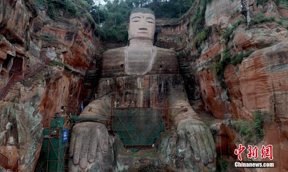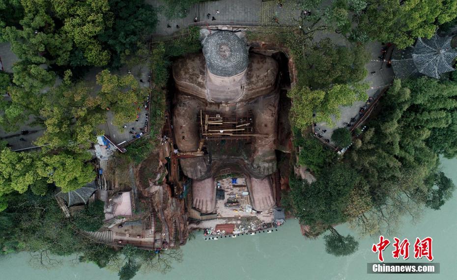 空中俯瞰大佛脚手架拆除作业现场。刘忠俊 摄