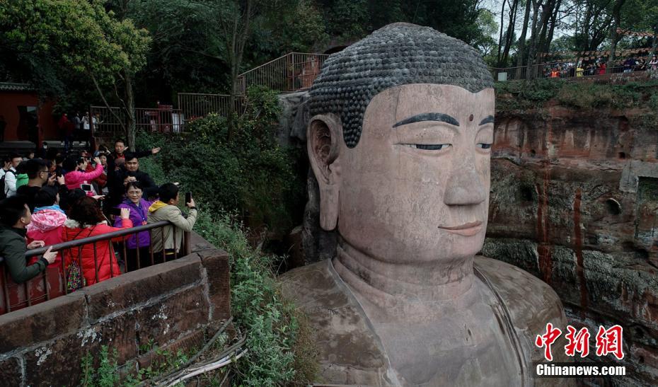 记者在现场看到,乐山大佛的“花脸”已被“清洗”干净,重露新颜,吸引了不少游客拍照。乐山大佛右侧悬崖边,有一条险峻的栈道自上而下盘旋至大佛脚下,这就是“九曲栈道”,通过栈道可以去“抱佛脚”。刘忠俊 摄