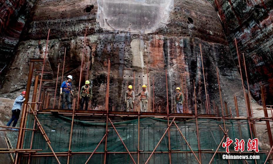 3月25日,四川乐山大佛胸腹部残损区域抢救性保护前期研究及勘测作业结束,正在对临时搭建的脚手架进行拆除作业。4月1日起,九曲栈道将重新向游客开放。图为脚手架拆除作业快要结束。刘忠俊 摄