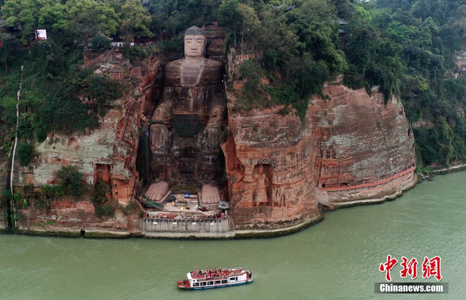 2018年国庆假期后,经国家文物局批准,乐山大佛景区管委会启动了大佛胸腹部残损区域抢救性保护前期研究及勘测工作。为避免游览活动和勘测作业交叉影响,预防安全事故发生,景区封闭了九曲栈道,禁止游客通行。刘忠俊 摄