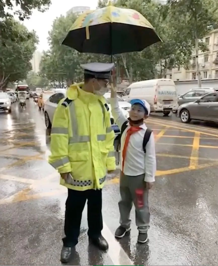 看到交警站在雨中执勤