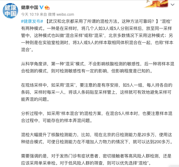 据介绍,“混检”有两种模式。一种是在采样时,将几个人如3人或5人分别采样后,放至同一采样管中,这种模式也叫做“混合采样”或称“混采”,北京多数情况下采用这种模式;另一种则是在实验室检测时,将3人或5人的样本取相同体积混合在一起,也称“样本混合”。从科学角度讲,第一种“混采”模式,不会影响核酸检测的敏感性,后一种将样本混合检测的模式,则对检测敏感性有一定的影响,但影响程度是已知的。