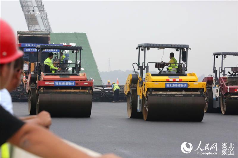 宜都长江大桥正在加紧铺装沥青。(李佳蔚 摄)
