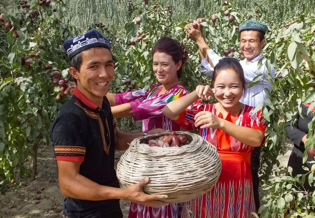 乌鲁木齐中支支持和田地区民丰县建立专业合作社带动贫苦户脱贫致富,图为合作社的红枣喜获丰收,社员们满脸“腰包鼓起来”的喜悦之情。