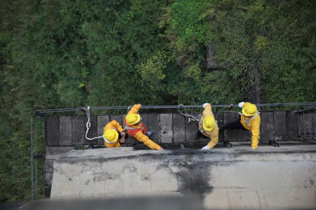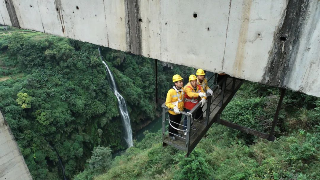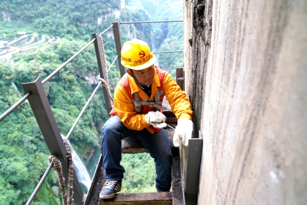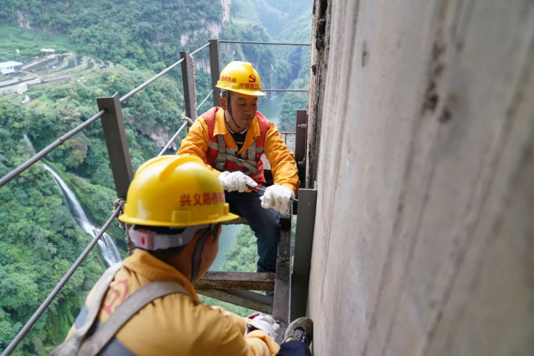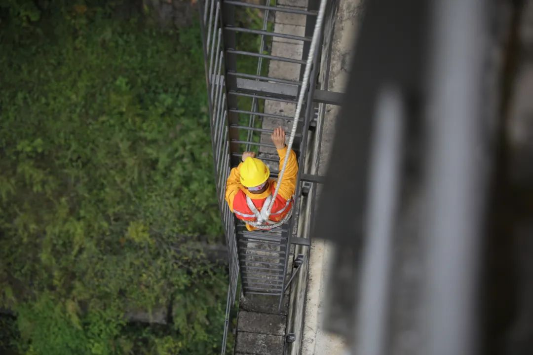 “工作第3年了,我最打怵的还是给栏杆除锈,往下看令人头晕目眩。峡谷的风从四面八方吹来,常常吹得人满脸铁锈。”张宝的徒弟彭仪说。他将安全绳扣在栏杆上,左手紧紧抓着托架,右手拿着打磨机进行打磨。空气中弥漫着厚重的铁锈味,汗水顺着彭仪的额头流下。