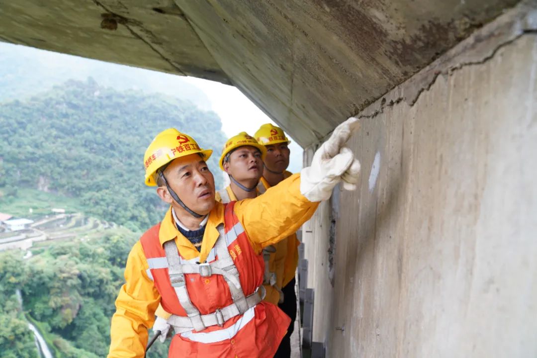 紧接着,张宝和大伙开始检查桥墩的混凝土结构,并用手按压桥墩壁,使用检查锤敲击桥墩检查是否存在裂纹。如果桥墩有裂纹,他们要马上用混凝土和砂浆材料修补。