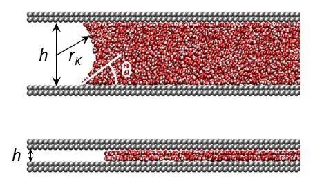(上)在通道内定义弯曲液面的接触角θ;(下)当通道只有几层水分子厚时,弯曲液面不存在,接触角无法被定义。