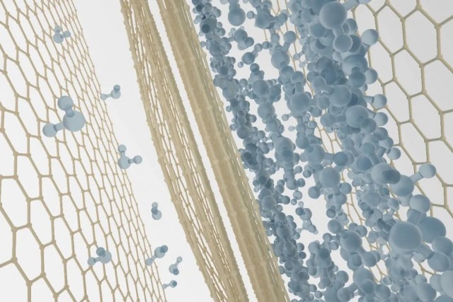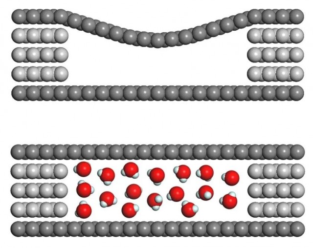 水分子(红色)在石墨烯通道(灰色)内发生凝聚后,通道的变形消失。