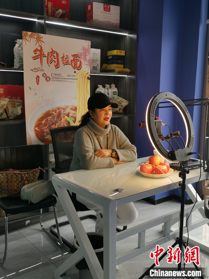 一位主播正在直播间推广延安地方特产。 中新网任思雨 摄。
