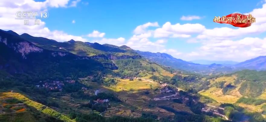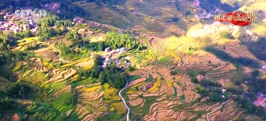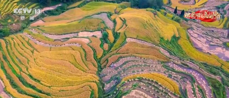 央视网消息: 这片秋日的万亩梯田位于重庆酉阳县花田乡何家岩村。沉甸甸的稻穗呈现出一片金黄,蜿蜒的田垄沿着山坡向下伸展次第铺开,犹如大地的“指纹”。