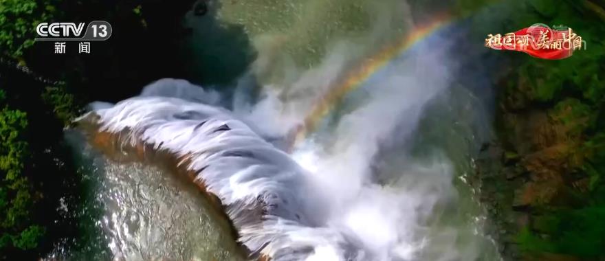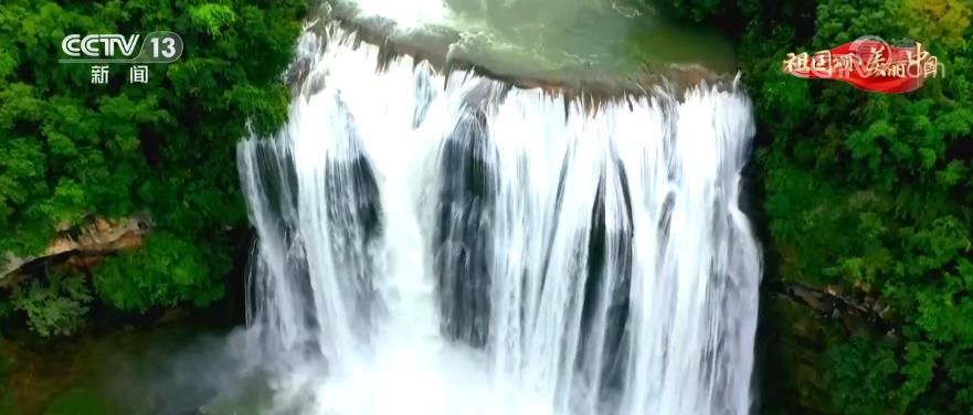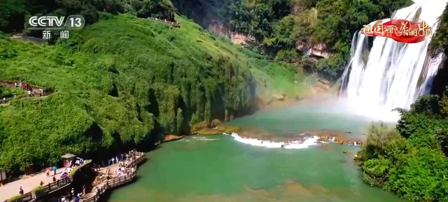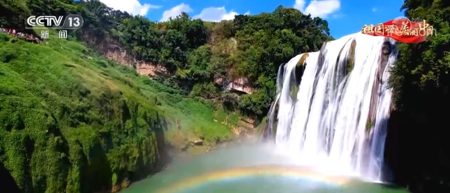 央视网消息: 这里是位于贵州安顺市的黄果树瀑布。整个瀑布高度为77.8米,宽101米,河水从断崖顶端凌空飞流而下,气势磅礴。春、夏、秋、冬,每个季节这里都有着不一样的形态。奔腾而下的河水犹如一张流动的大白布,瀑布激起的水花如雨雾般腾空而上,随风飘散。