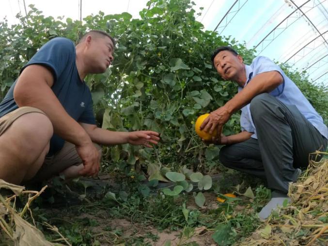 武志强(左一)与乡亲在华莱士瓜大棚里交流