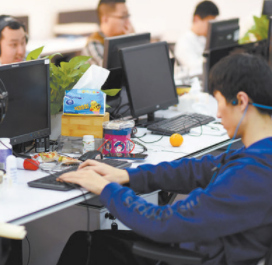 刘彪的主要工作是写代码。他不用开电脑屏幕,戴着耳机,边听边写一行行代码。多数时候,他半低着头,双手搭在键盘上,噼里啪啦地敲字符。有时候遇到了坎儿,他会摘下耳机,若有所思。