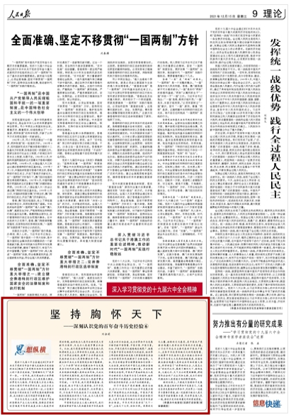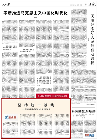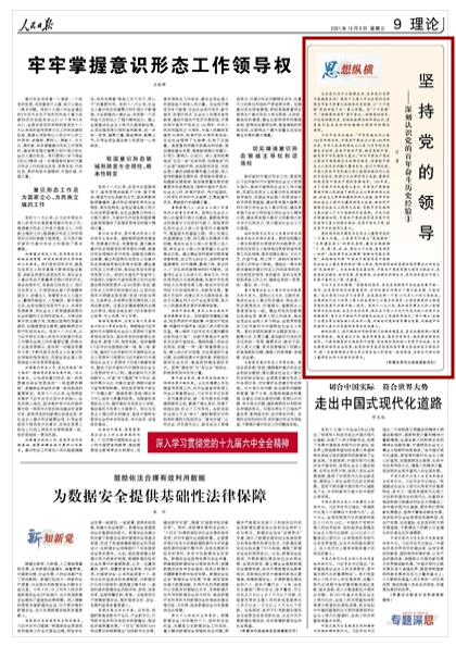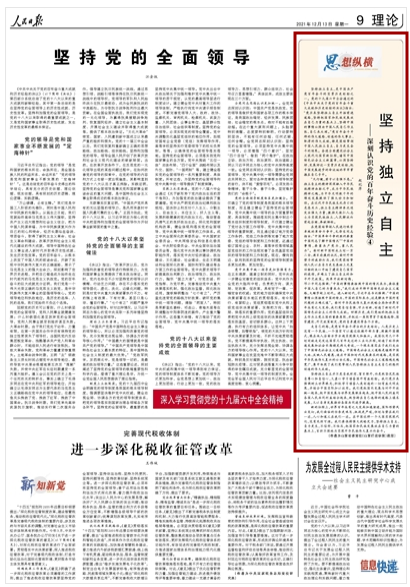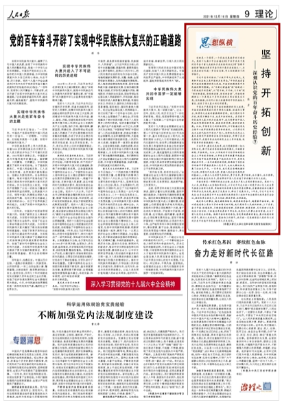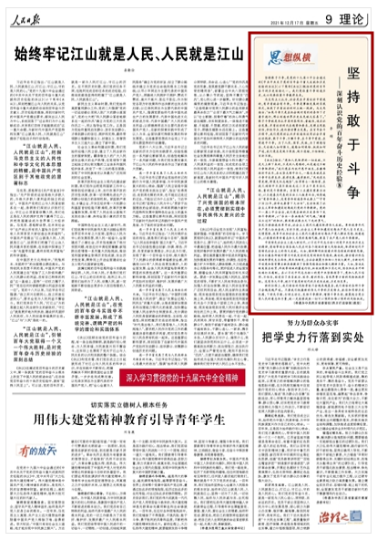 本期主题:党的十九届六中全会审议通过的《中共中央关于党的百年奋斗重大成就和历史经验的决议》,将“十个坚持”(即坚持党的领导、坚持人民至上、坚持理论创新、坚持独立自主、坚持中国道路、坚持胸怀天下、坚持开拓创新、坚持敢于斗争、坚持统一战线、坚持自我革命)概括为党百年奋斗的十条历史经验,具有根本性和长远指导意义。近日,人民日报理论版“思想纵横”专栏刊发十篇文章,系统解读“十个坚持”的丰富内涵。