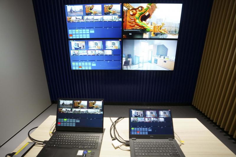 整个测试赛的“云上制作中心”其实就位于云转播科技公司的首钢办公区,一台笔记本、一个屏幕就完成了“云上制作中心”的搭建。据北京国际云转播科技有限公司相关负责人介绍,当前端信号通过5G背包传来后,导播人员在办公区可以统一完成多画面的导切、音频及字幕的制作,最后将信号分发到多个媒体进行直播。