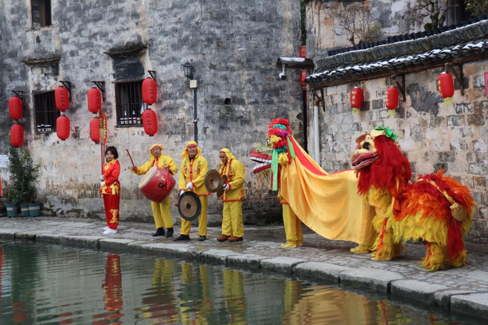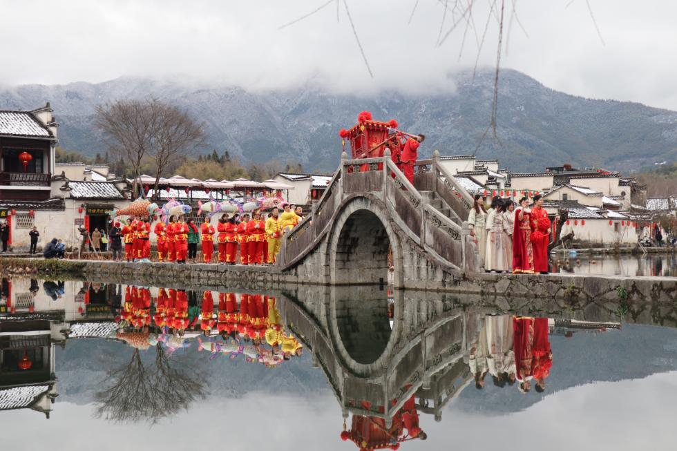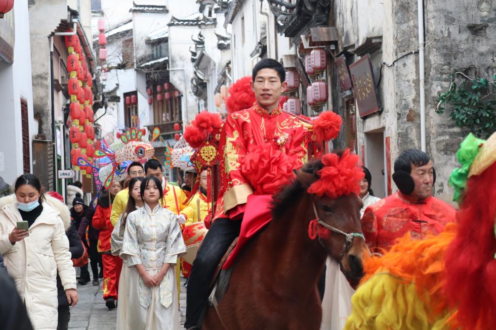 央广网合肥2月11日消息(记者张宣剑 通讯员黄洁 方龙 何彦铭)抛绣球、选佳婿,骑大马、抬花轿,绕古树、踩福袋,舞花灯、敲锣鼓。近日,一场古色古香、独具传统徽州民俗文化特色的婚礼在黟县雪后的宏村上演。新郎骑着高头大马,新娘坐上大红花轿,浩浩荡荡的迎亲仪仗队伍举着喜庆的花灯,伴随着锣鼓声,走遍宏村的各个地点,街头巷道热闹非凡。