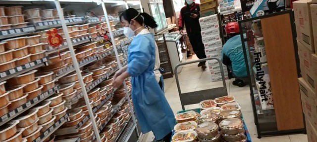 好多人加我,我都不知道是谁,也没备注,有时找一个人找半天,看发了什么内容,再去一一回复。很多是朋友介绍来加的,甚至有闵行区、静安区的,还有个人骑了5公里,跑来店里买东西。基本上他们过来的都能吃到东西。疫情暴发之前,我就给领导说了(加大订购量),后来公司又想办法增加了一批物资,鲜食这块从一开始就没断过。最近盒饭进1000多份,饭团三明治1500个,还有一些寿司、粥总数将近3000份,基本上都完销。平时我们客流量也就三四百人,赶上节假日五六百。但最近我们每天七八百单,有一部分还是团购单。我手机都快被打爆了,(经常)充着电不停地打。