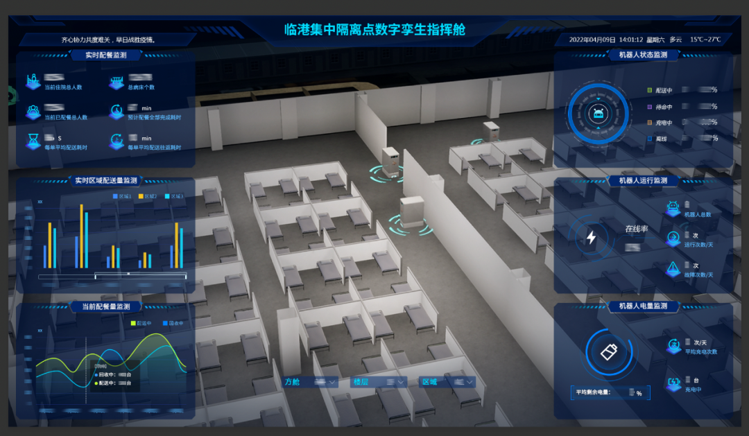 近300台机器“小白”都有一个统一的“大脑”。通过激光SLAM(同步定位与建图)技术精确重建室内三维地图,构建1:1映射的虚实融合的数字孪生基座服务,打造统一数据平台,实现对机器人的集中管控以及舱内数据的实时监测,助力管理人员高效决策,支撑对临港方舱的调度一体化、数据透明化的全过程高效管理。据悉,这是首次实现了方舱医院场景下的多种类机器人的规模化、体系化部署和数字孪生系统虚实融合的实战应用。上海临港方舱医院的相关经验将复制推广到国家会展中心方舱等其他方舱医院。