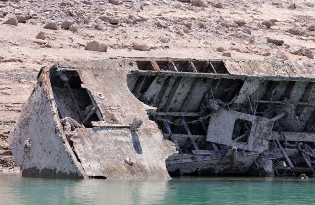 当地时间2022年7月28日,美国内华达州,米德湖国家游乐区,一艘二战时期沉没的希金斯登陆艇侧躺着。