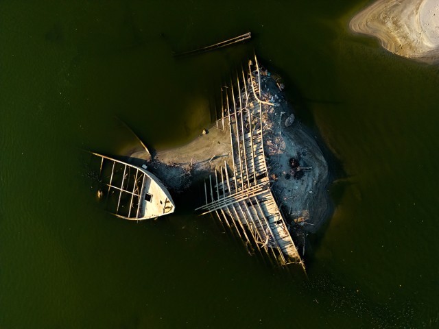 当地时间2022年8月17日,匈牙利西北部的瓦莫萨巴迪附近,一艘二战期间沉没的船只的残骸显露。