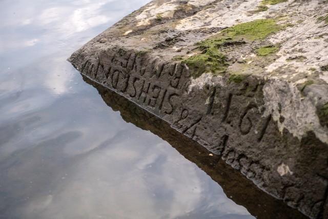 当地时间2022年8月18日,捷克德辛,易北河“饥饿之石”上的铭文清晰可见。