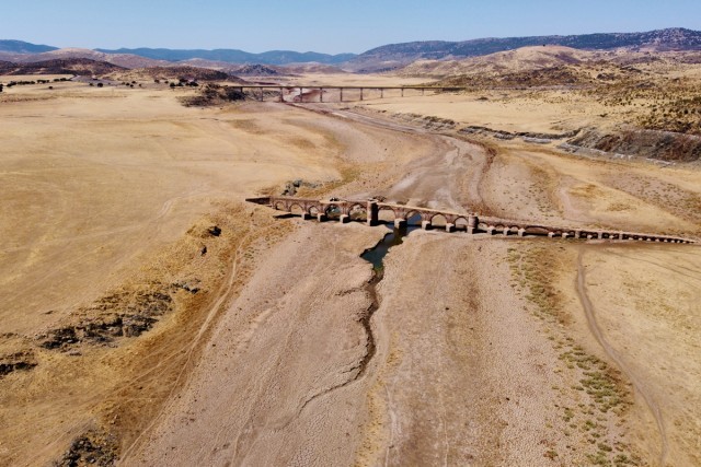 在干涸的西班牙锡哈拉水库,上世纪50年代因水库落成而被淹没的梅斯塔古桥也重见天日。西班牙今年夏天经历多轮热浪。由于高温和缺乏降水,全国水库蓄水量不足40%。