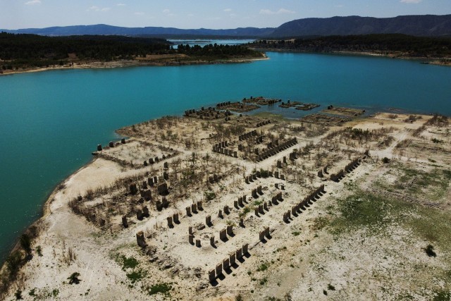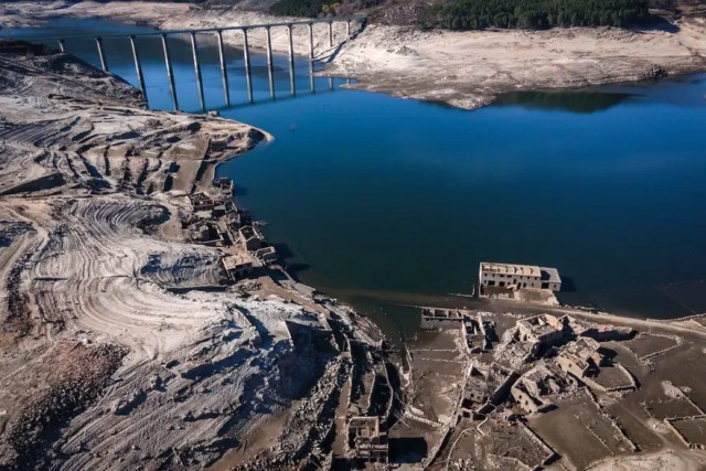 西班牙马德里以东的布恩迪亚水库也已“触底” ,使得拉伊莎贝拉皇家浴室遗址重新浮出水面。而在巴塞罗那附近的另一座水库干涸,导致一座9世纪的罗马式教堂完好无损地裸露出来。