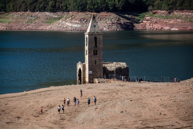 当地时间2022年8月8日,西班牙巴塞罗那北部,浮出水面的教堂遗迹吸引人们前往参观。