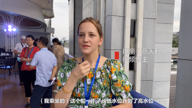 8月23日,参加2022“打卡中国·最美地标”活动宜昌段的意大利视频博主瑞丽打卡葛洲坝,乘坐了全球载电量最大的纯电动“长江三峡1”号游轮,在葛洲坝船闸体验了一把“水涨船高”的感觉,感叹太神奇了。