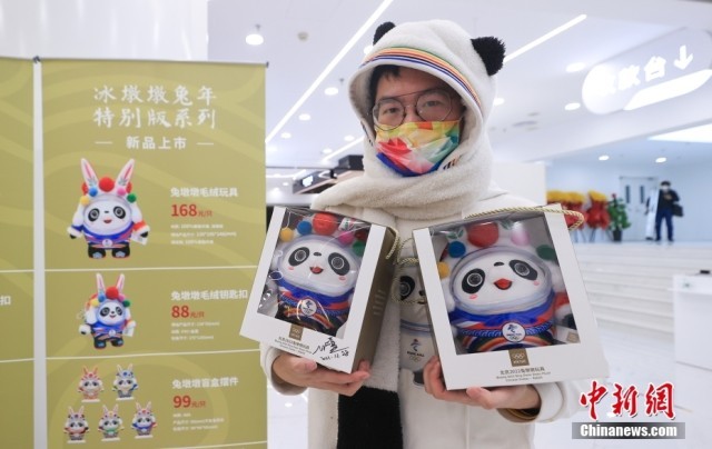 12月28日,“北京2022冰墩墩兔年特别版系列”在北京发布。此次系列新品是以北京传统民俗中的经典兔子形象“兔爷”为创意点,形成具有民族特色的“兔墩墩”。此次发布的“冰墩墩兔年特别版”系列新品,既是庆祝北京2022年冬奥会一周年,同时是对即将到来的兔年寄予新春的祝福。图为北京王府井工美大厦柜台展示的“兔墩墩”。