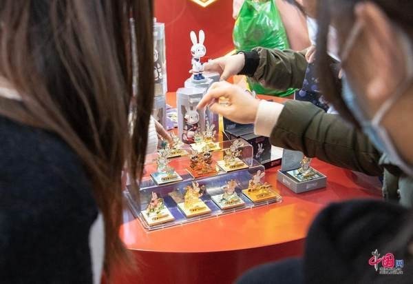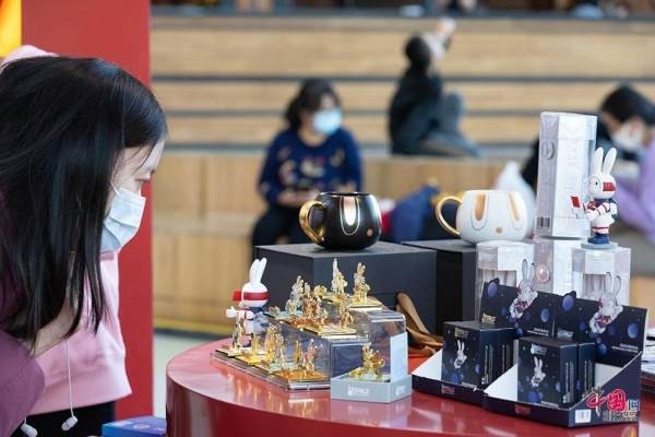 观众在“中国探月太空兔”展陈活动现场,观看探月航天IP文化产品。中国网 杨佳 摄影