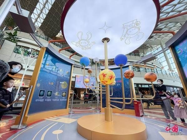 观众在“中国探月太空兔”展陈活动现场,观看展示的太阳星系。中国网 杨佳 摄影