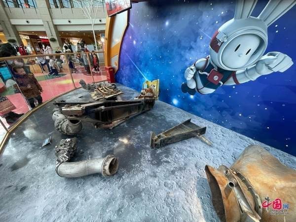 观众在“中国探月太空兔”展陈活动现场,观看展示的火箭残骸。中国网 杨佳 摄影
