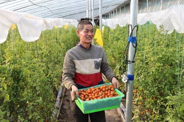 不仅是马铃薯,在村南边,还有连片的西红柿温室大棚,俯身进入,瞬间被暖意包围。橙红色的、圆溜溜的西红柿,紧紧挨在一起,56岁的村民秦恩宝正在忙着搬运刚刚采摘的西红柿。