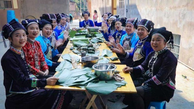 邻居们也前后脚赶来帮忙,大伙儿围坐一起,将腌制好的腊肉裹进糯米,用棕叶捆绑好,再放入铁锅内,用柴火蒸煮。袅袅炊烟盘旋缭绕,空气中弥漫着令人垂涎的香味,迎接春节的仪式感十足。