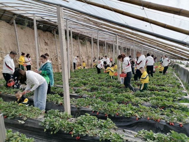 春节期间,在山西省吕梁市严村,游客在李兔云的草莓大棚内采摘。(受访者供图)
