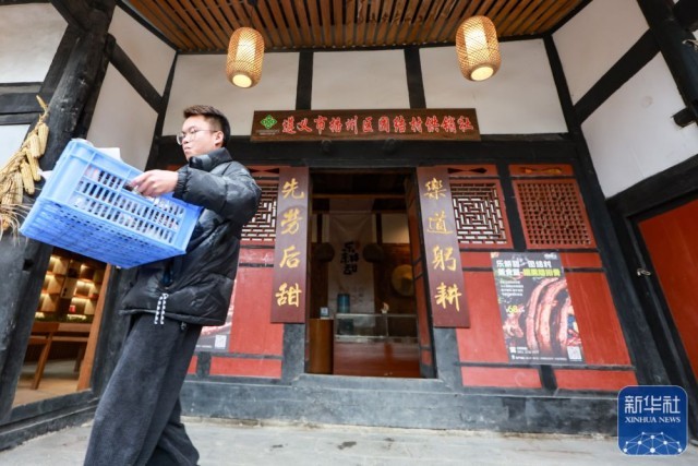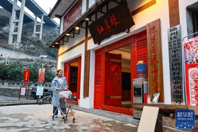 ↑村民在团结村供销社前搬运货物(2月2日摄)。仁遵高速通车后,大量游客来到团结村观光旅游。