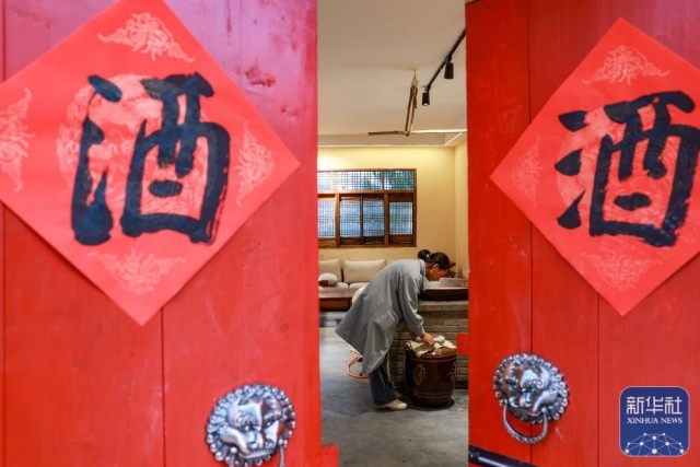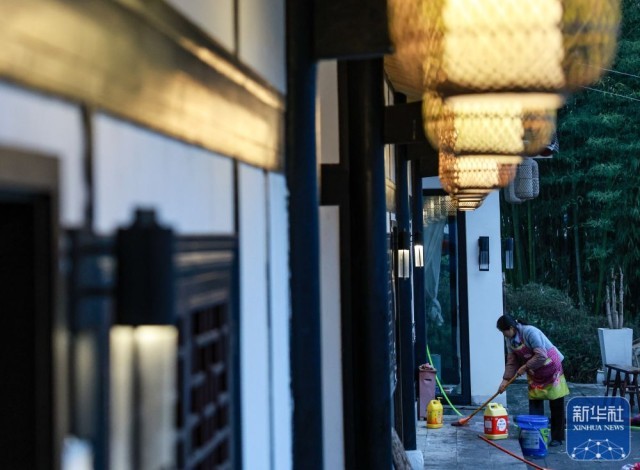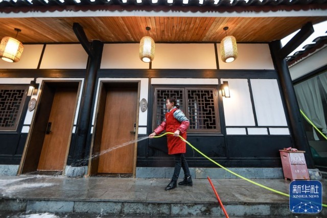 ↑团结村村民在打扫民宿的卫生(2月2日摄)。仁遵高速通车后,大量游客来到团结村观光旅游。
