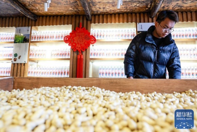 ↑村民在团结村供销社内摆放货物(2月2日摄)。